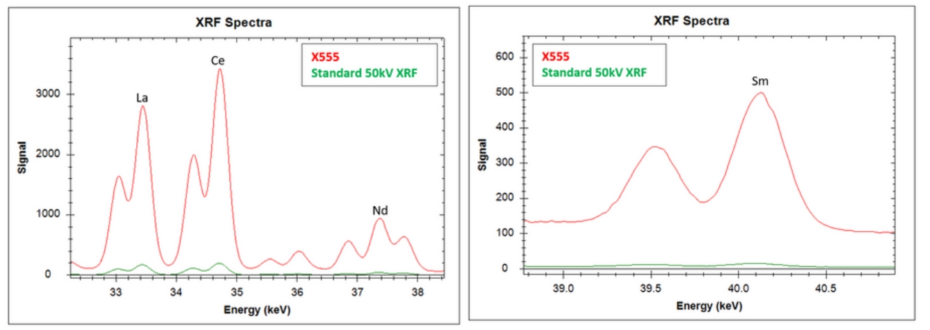 X-555利用55kV X射線管能更好地激發(fā)稀土元素能量。超大的70mm2 SDD硅源移探測(cè)器,更有效地檢測(cè)到更高的能量釋放,這實(shí)現(xiàn)了10倍更高的計(jì)數(shù)率(如:鑭)和30倍更高的計(jì)數(shù)率(如:釤Sm)。