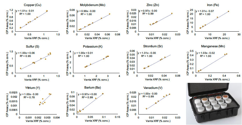 圖2. Vanta手持式XRF分析儀測量由OREAS提供的放于各種試劑盒中的斑巖銅和IOCG元素所獲得的數(shù)據(jù)與這些樣品的額定值高度吻合,表明了Vanta分析儀測量這些元素的出色性能。