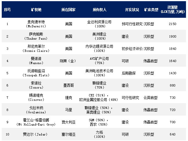 根據總資源量(LCE,碳酸鋰當量,萬噸,以下同),Mining Intelligence網站列出了世界前十大粘土和硬巖鋰礦。
