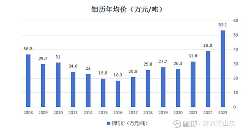 自2017年以來,在鉬供應端產量保持穩定,而鉬需求穩步提升的背景下,全球和國內鉬行業供需格局都呈現緊平衡狀態,鉬價格也進入上漲周期,2023年鉬均價達到了53.1萬噸。未來兩年,鉬的供給端增量不大,增量集中于2027年及以后,主要是沙坪溝項目投產,新增2.72萬噸產能,以及大黑山鉬礦擴產,新增0.64萬噸。