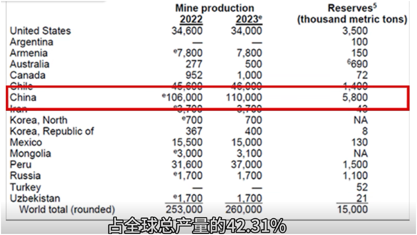 鉬,作為一種重要的不可再生的稀缺性戰略資源,以其獨特的性能廣泛應用于鋼鐵冶金、農用化肥、電氣化工和航天等領域。根據USGS數據顯示,2023年,中國鉬礦資源儲量為580萬噸,占全球資源儲量的38.67%。其次為美國和秘魯,2023年鉬礦資源儲量分別為350萬噸和150萬噸,分別占比23.33%和10.00%。同時,中國也是全球最大的鉬生產國,據美國地質調查局數據顯示,2023年,全球鉬產量約26萬噸,其中,中國約11萬噸,約占全球總產量的42.3%。
