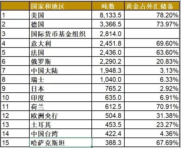 截至2020年2月,全球前十五官方黃金儲備數(shù)據(jù)一覽: