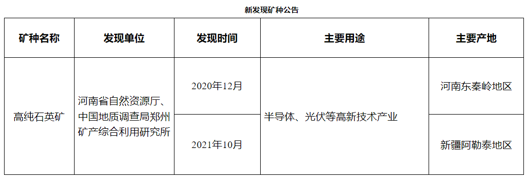 記者今天(10日)從自然資源部獲悉,《新發(fā)現(xiàn)礦種公告》近日發(fā)布,其中確定了一個新礦種——高純石英礦。