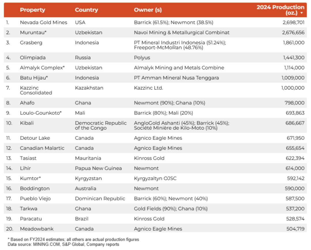 根據(jù)實(shí)際或估計(jì)的產(chǎn)量,外媒mining.com對(duì)2024年前20名黃金生產(chǎn)業(yè)務(wù)進(jìn)行排名。位于美國(guó)內(nèi)華達(dá)州的內(nèi)華達(dá)金礦(Nevada Gold Mines,簡(jiǎn)稱NGM)2024年生產(chǎn)269.87萬(wàn)盎司黃金(約84噸),是全球最大的金礦綜合體。該綜合體自加拿大黃金巨頭巴里克黃金放棄對(duì)美國(guó)競(jìng)爭(zhēng)對(duì)手紐蒙特的敵意收購(gòu)后,雙方創(chuàng)建的合資公司,將兩家公司在內(nèi)華達(dá)州的資產(chǎn)合并在一起。目前,該金礦綜合體包括10個(gè)地下礦山和12個(gè)露天礦組成,巴里克黃金(Barrick Gold)持股61.5%,紐蒙特(Newmont)持股38.5%。