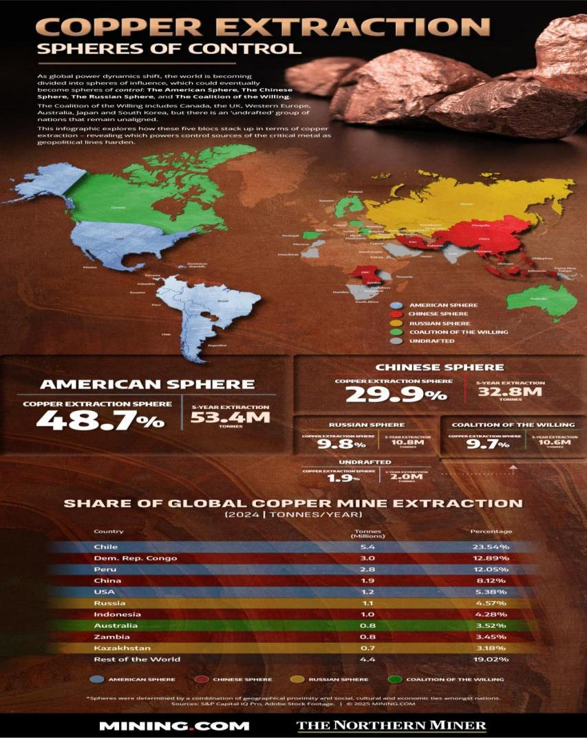 從世界維度來看,美國作為頭號資本強國,通過跨國礦業巨頭控制著全球眾多優質銅礦資源。美國本土占主導的是斑巖型銅礦,依賴大規模露天開采和先進選礦技術,環保成本較高,銅礦平均品位較低(0.4%-0.6%),低于智利(0.7%-1%),開采成本較高(全球前10大低成本銅礦中無美國項目)。出于資本逐利的本性,跨國礦業巨頭優先“掐尖”占有和開發全球成本最低的優質銅礦,這也是美國國內銅礦開發滯后的一個重要原因。近期MINING網站和北方礦業從地緣政治的角度繪制了銅資源控制全球地圖,根據地理、社會、文化和經濟聯系以及在更加兩極分化的世界中可能出現的結盟,將世界的銅資源分成五個“控制范圍”:美國、中國、俄羅斯、自愿聯盟和未開發。過去五年,美國以48.7%的全球銅產量領先,中國以29.9%緊隨其后,俄羅斯和自愿聯盟各占不到10%,還有1.9%未被開發。通過此圖可以看出,美國資本所控制的跨國礦業集團還是優先開發全球具有成本競爭力的銅礦項目。